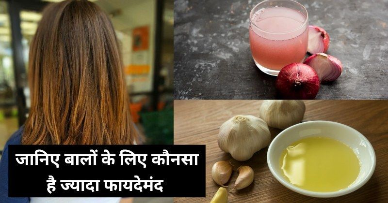 प्याज सल्फर से भरपूर है यह बालों की जड़ों में ब्लड सर्कुलेशन बेहतर बनाने के साथ स्कैल्प इंफेक्शन से लड़कर बालों के विकास को बढ़ावा दे सकता है और झड़ते बालों पर लगाम लगा सकता है। जबकि, लहसुन प्याज की तुलना में थोड़ा बेहतर इसलिए हो सकता है क्योंकि इसमें एंटीबैक्टीरियस गुण होते हैं, साथ ही सेलेनियम और जिंक भी होते हैं, जो बालों की ग्रोथ के लिए बेहतर तरीके से काम करते हैं। इसलिए अगर आप बाल बढ़ाने के लिए इस्तेमाल कर रहे हैं तो लहसुन के तेल का इस्तेमाल करें और अगर आप झड़ते बालों के लिए इस्तेमाल कर रहे हैं तो प्याज का पानी लगाएं।